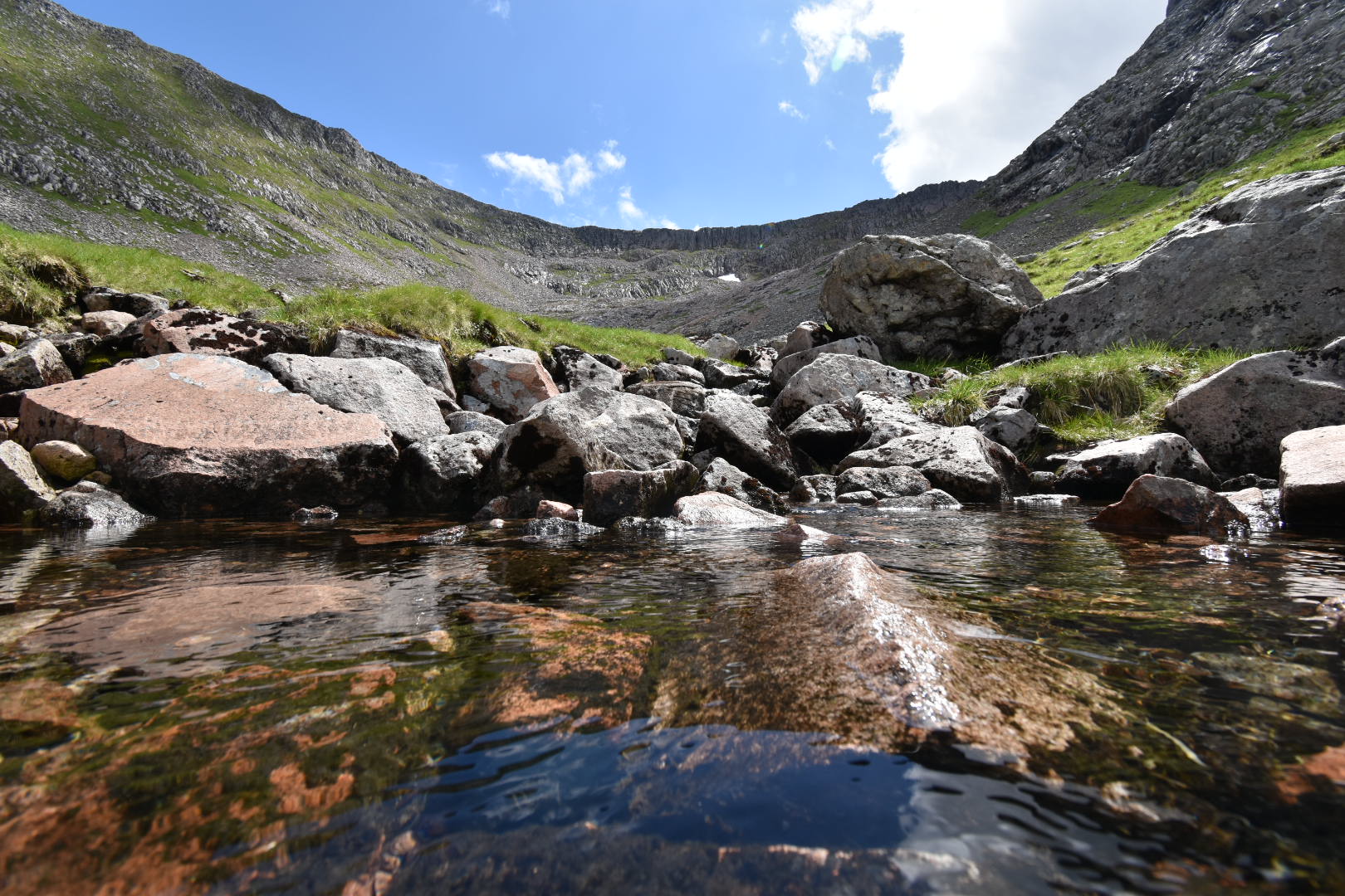 Our water begins its gradual descent. Filtering through a thing layer of peat, it flows under impassable granite into two caraggy lochans, Coire Leis and Coire na Ciste. Onwards